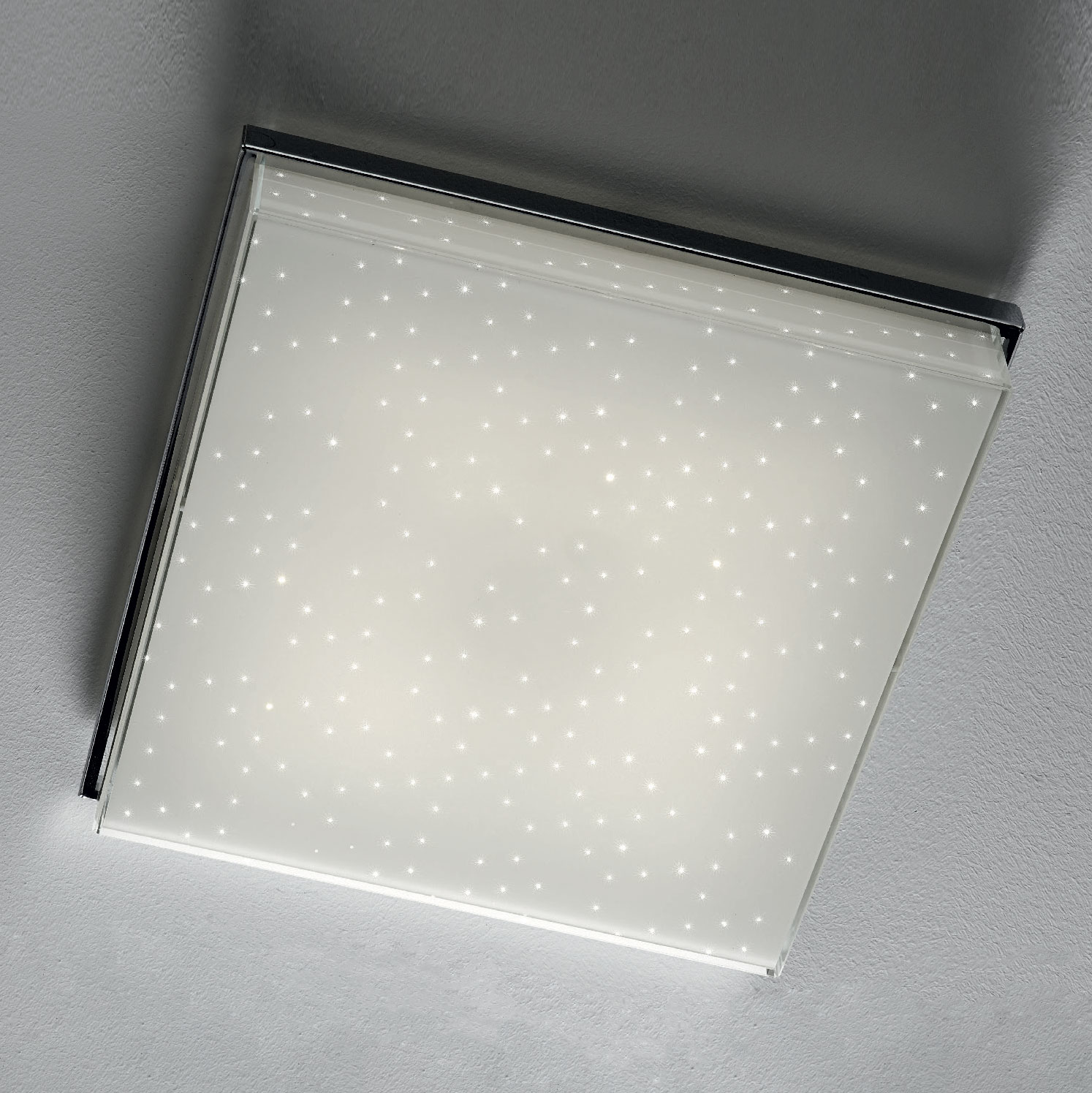 Plafoniera Montatura rifinita in cromo. Vetro serigrafato bianco lucido con puntini trasparenti. Led integrato 3.000K.