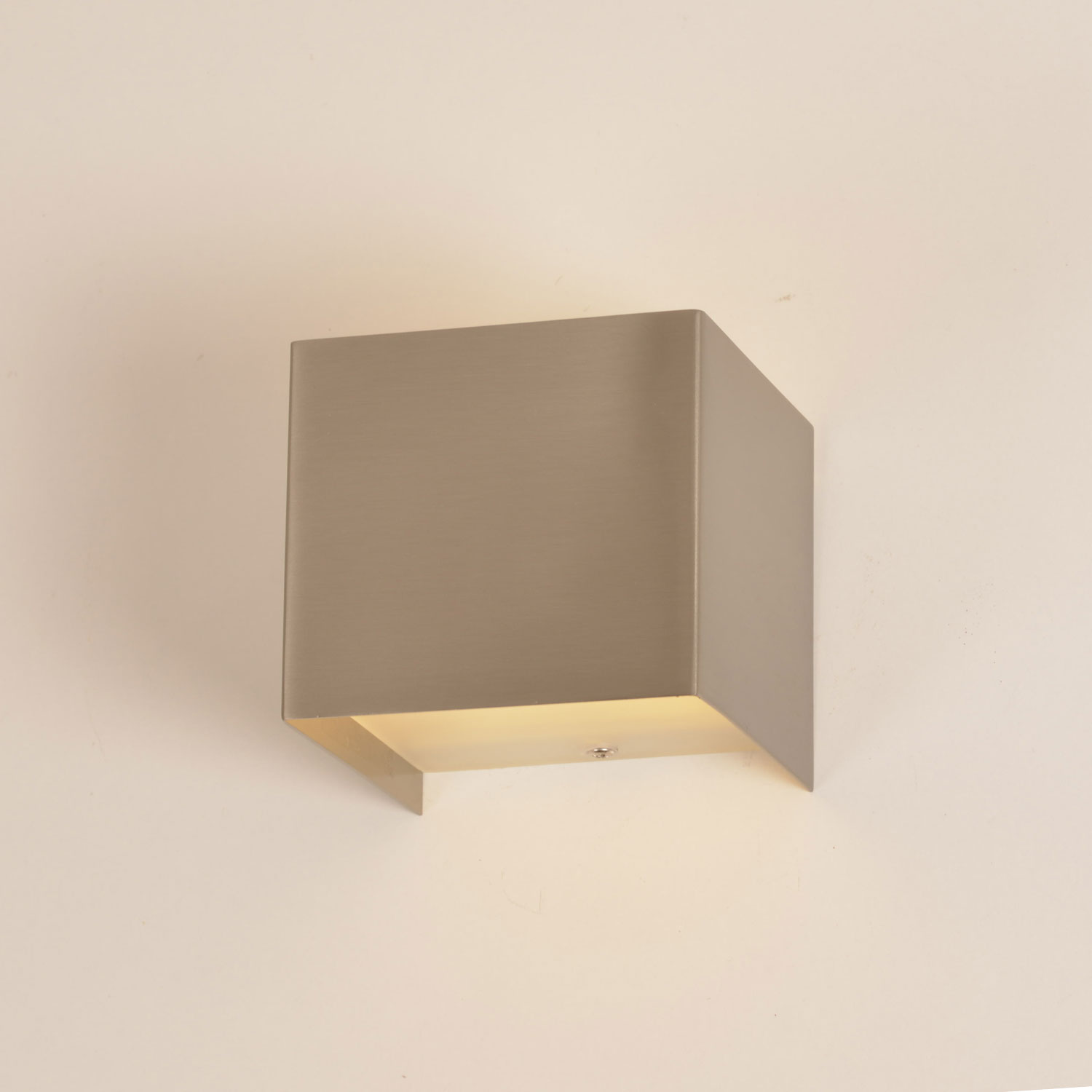 - Vetro Superiore e Inferiore Satinati: A differenza delle applique aperte, Cubetto scherma la sorgente luminosa con due eleganti vetri satinati. Questo permette una diffusione della luce bidirezionale (su e giù) estremamente morbida, eliminando ogni riflesso fastidioso e creando una "carezza di luce" sulle pareti.